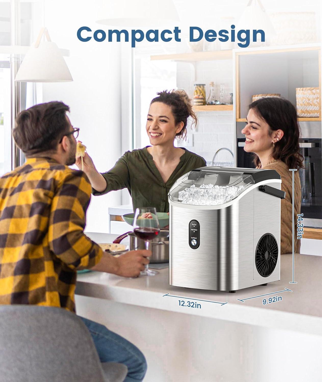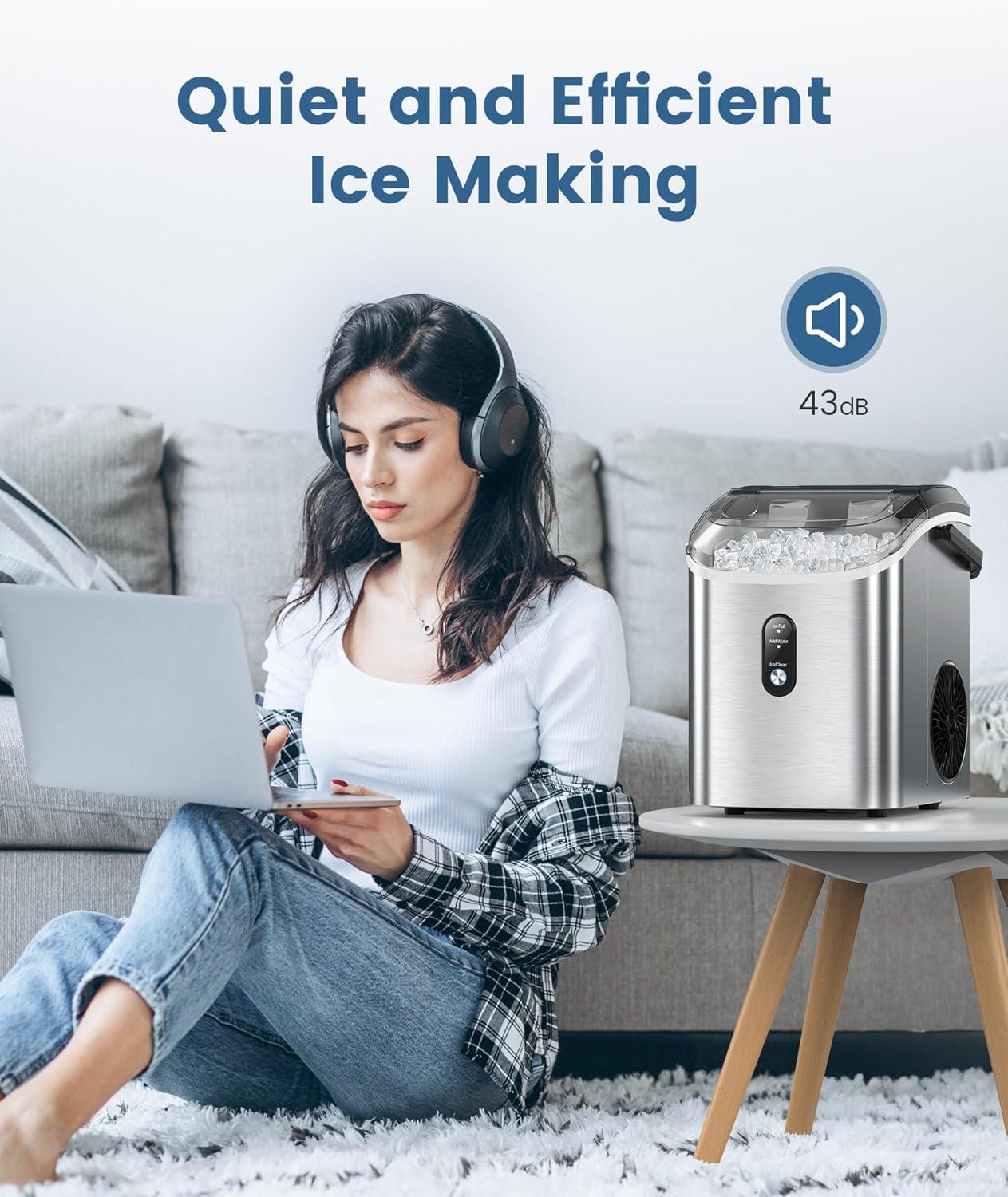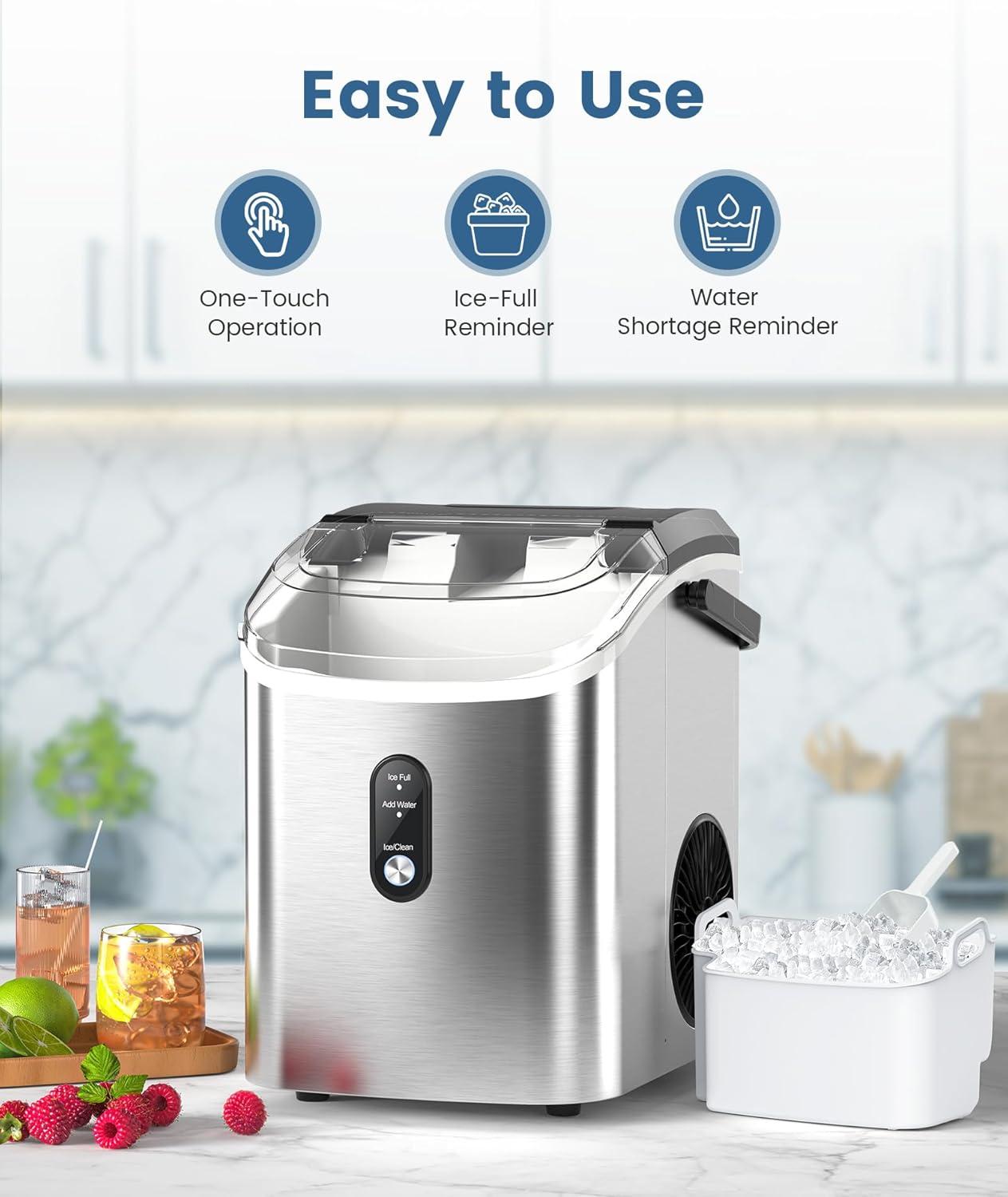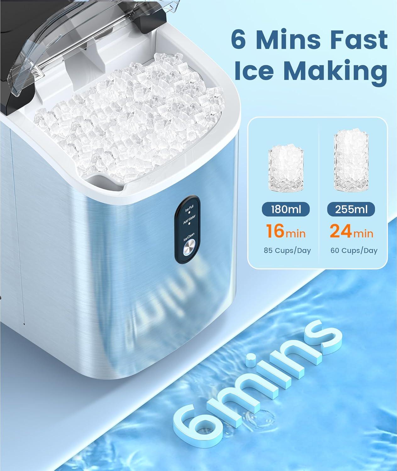Chewable-Soft Nugget Ice: The chewable ice produced by our nugget ice maker has a soft texture and a large surface area to cool your drink faster and provide an incredibly refreshing experience. It is perfect for use in iced coffee, smoothies, and as a snack ice cube to chew on.